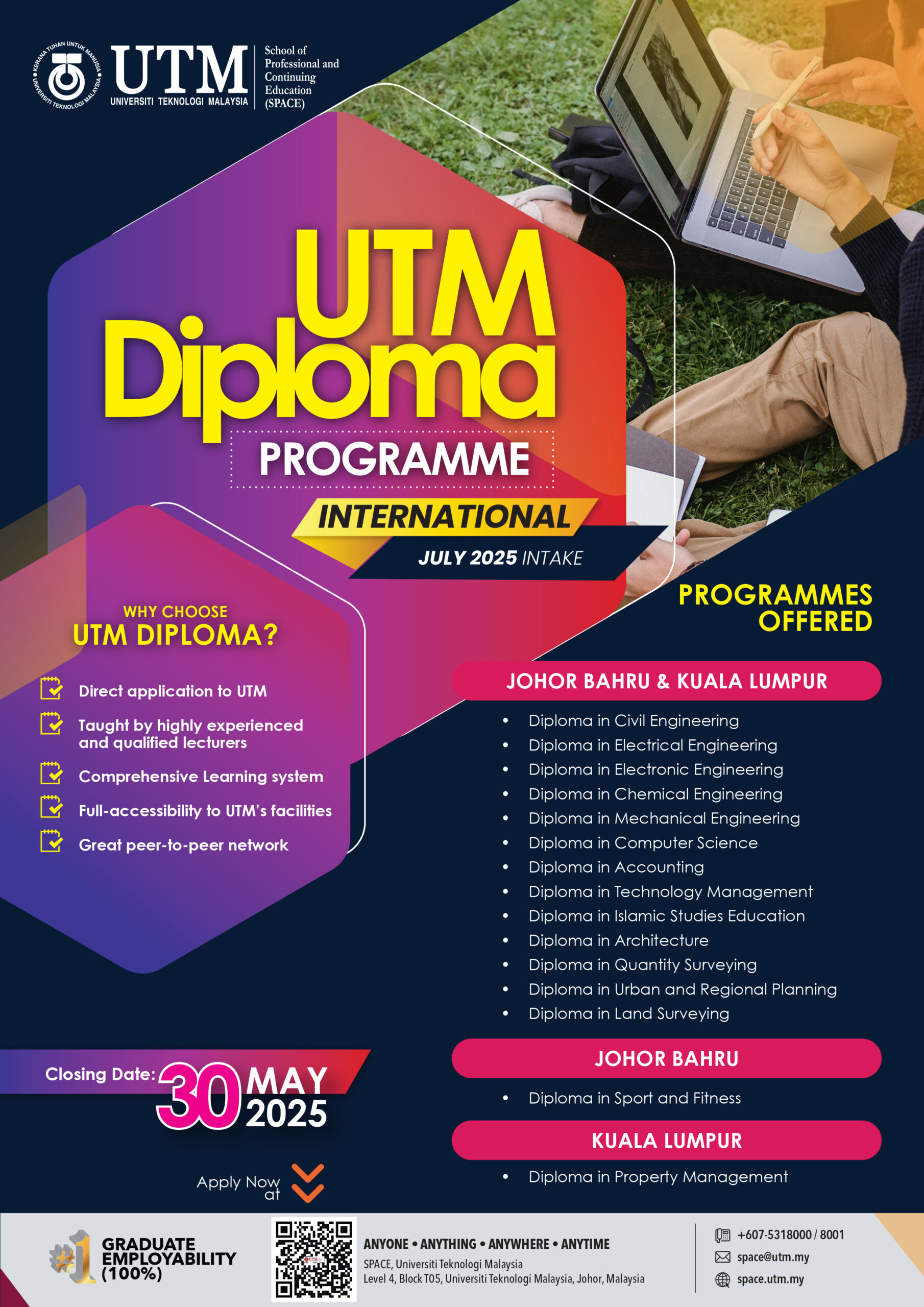 Calon lepasan Sijil Pelajaran Malaysia (SPM), semakan kelayakan untuk melanjutkan pengajian ke peringkat Asasi UTM dan Diploma UTM boleh dilakukan dengan pantas menerusi Sistem UTM My Dream di pautan https://mydream.utmspace.edu.my/spm