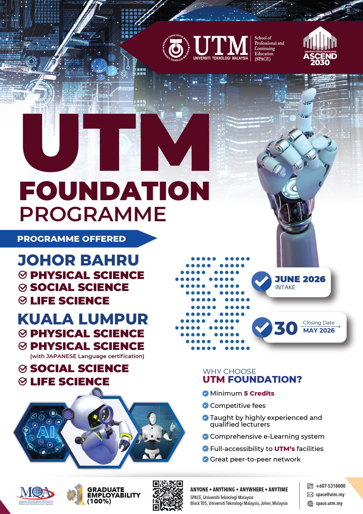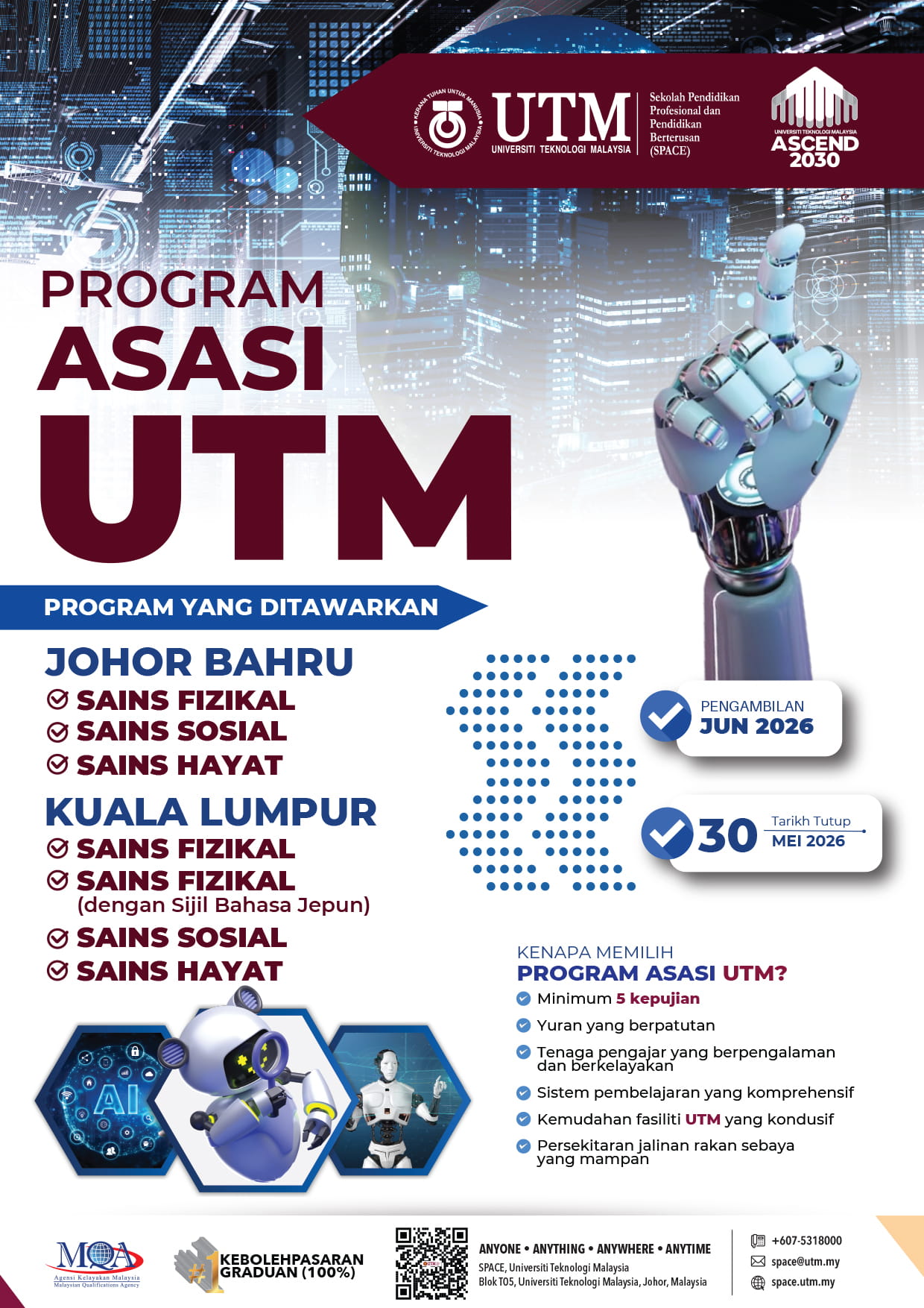 ☎ +607 531 8000 (JB) | ☎ +603 2728 6500 (KL) | ✉ space@utm.my