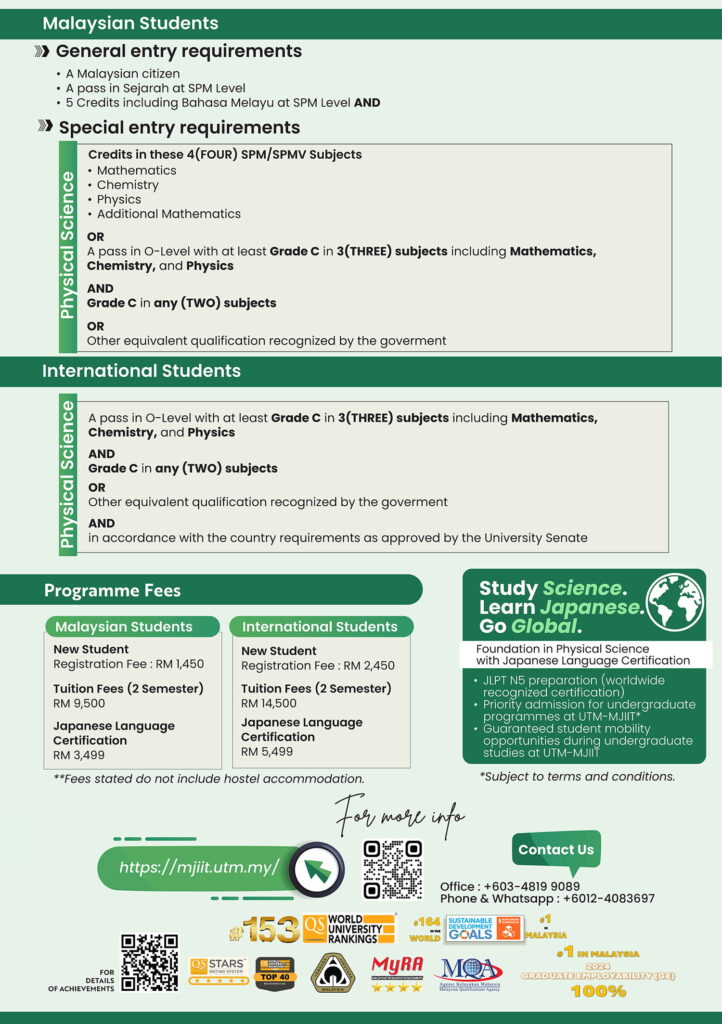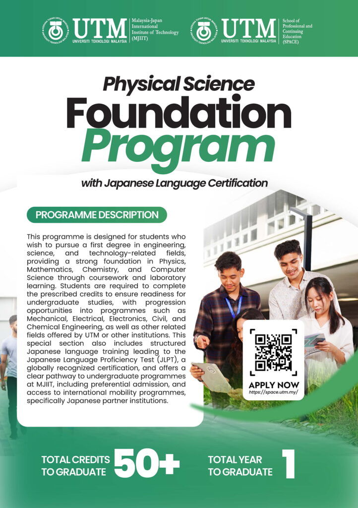 Subject to their academic achievement, they may choose to enrol in science, engineering and technology academic programmes, or social science programmes offered by UTM or other institutions. The Foundation Programme is open to both Malaysian and international students.