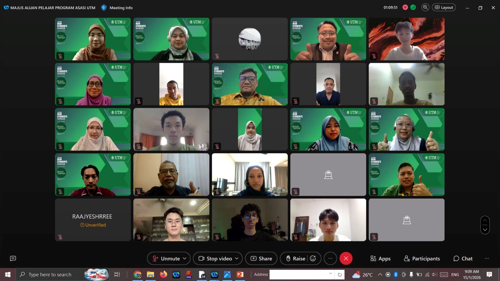 Johor Bahru, 15 Januari 2026 – Sekolah Pendidikan Profesional dan Pendidikan Berterusan (SPACE), Universiti Teknologi Malaysia (UTM) telah menganjurkan Majlis Alu-aluan Pelajar Baharu secara dalam talian sebagai sambutan rasmi kepada pelajar yang memulakan pengajian dalam Program Asasi Sepenuh Masa Semester 2, Sesi Akademik 2025/2026.